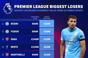 英超身价跌幅榜:罗德里和福登均下降2000万欧列前2,枪手4人上榜