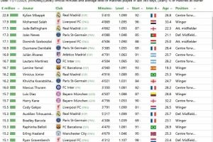 - 2025-11-12CIES球员应得最高年薪排行:姆巴佩2280万欧居首,萨拉赫位居次席